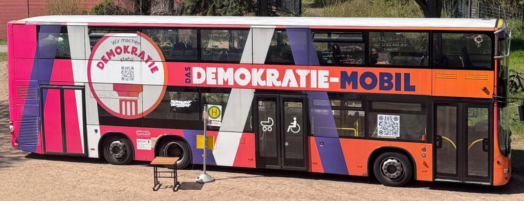 In spannenden Workshops beschäftigen sich die Kinder abwechslungsreich mit Themen wie Fairness, Zusammenleben, Meinungsvielfalt und demokratischen Grundwerten. Das Demokratie-Mobil versteht sich als fahrendes Klassenzimmer und schafft Raum für Gespräche, Fragen und gemeinsames Nachdenken.