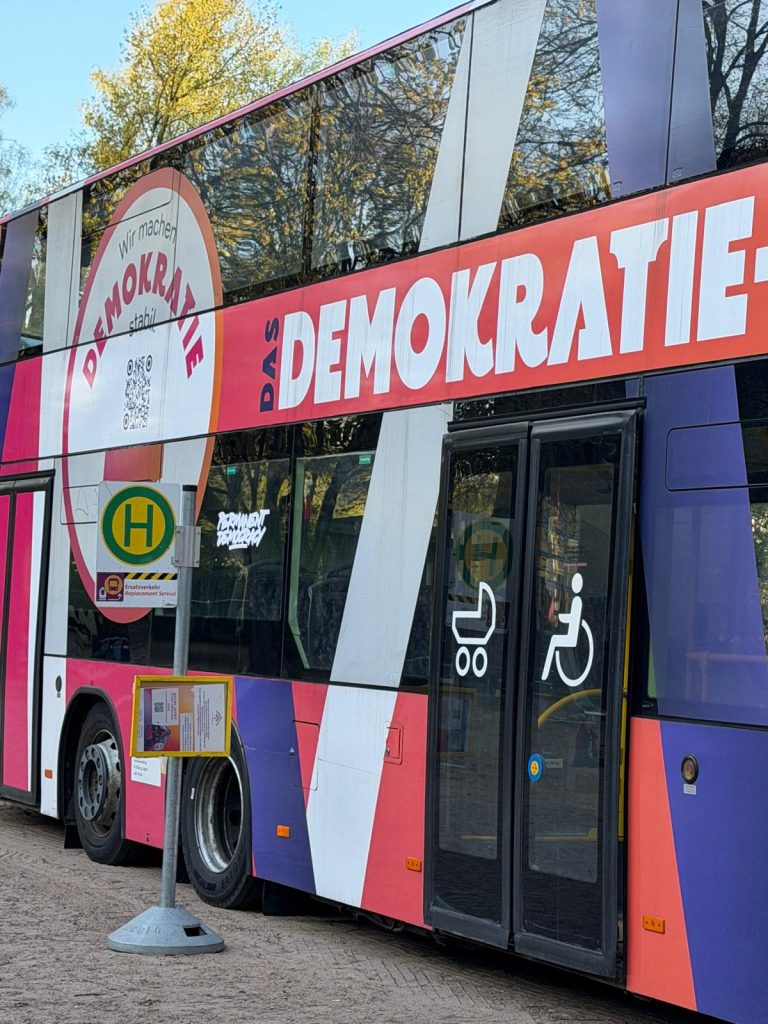 Noch bis Montag, 27. April 2026 ist das Demokratie-Mobil bei uns in der Grundschule Am Sandhaus! Der umgebaute Berliner Doppeldeckerbus des Mernissi-de Gouges Bildungs- und Sozialwerks macht Station auf unserem Schulgelände und bringt Demokratiebildung direkt zu unseren Schülerinnen und Schülern.