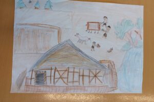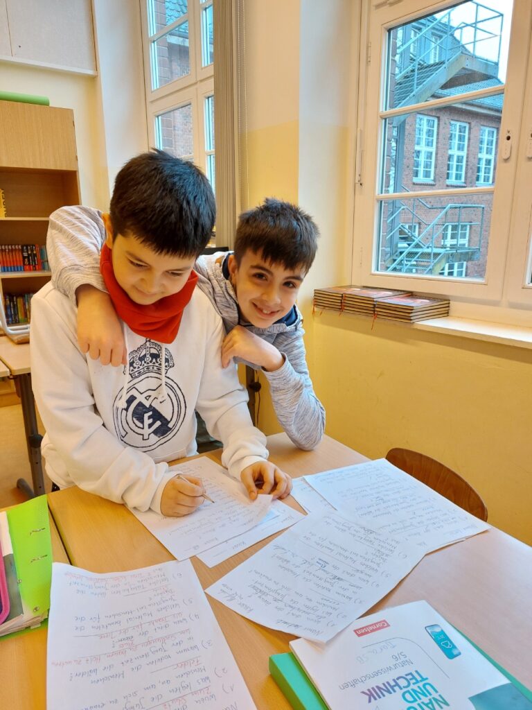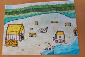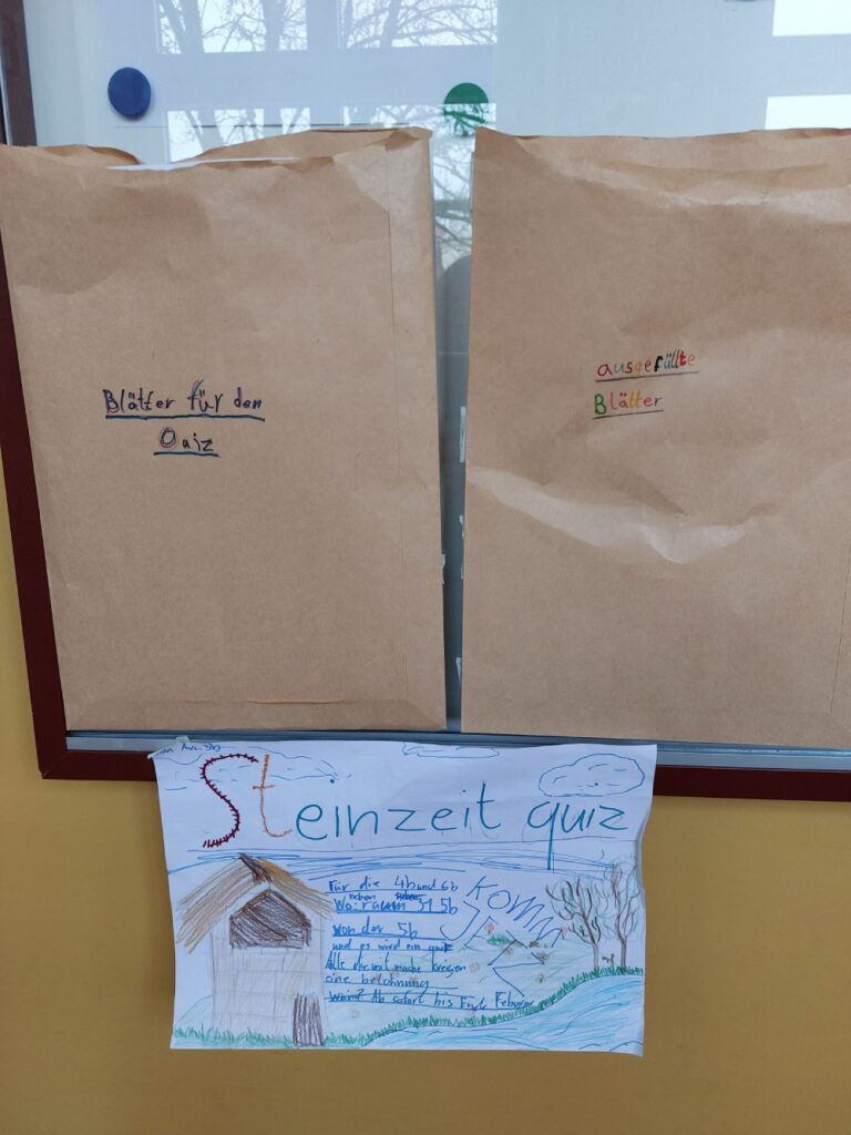 Im Fach Gewi (Gesellschaftswissenschaften) arbeiten wir auch außerhalb des Klassenraums. Die Klasse 5b hat für die Nachbarklassen einen Qiuz zum Thema Steinzeit vorbereitet, durchgeführt und ausgewertet. Besonders viel Energie haben die Schülerinnen und Schüler in die fachlich korrekten Zeichnungen von Steinzeitdörfern gesteckt. Seht selbst! Versucht die Fragen mit Hilfe der Zeichnungen zu beantworten!
